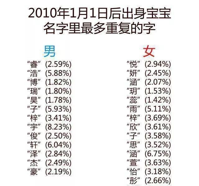 进入新世纪以后,中国第一批独生子女开始为人父母,他们大都受过良好教育,希望给孩子取一个有文化、有内涵还能彰显个性的名字。但事与愿违,虽然文雅响亮有内涵,但雷同率好像更高了。于是,00后、10后男孩名中“轩”“浩”“宇”“睿”,女名中“涵”“梓”“萱”“思”成为爆款。