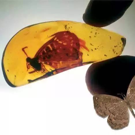 琥珀是远古时代的树脂化石,用一包晶莹剔透困住了昆虫甚至是青蛙和蜥蜴。琥珀的天然保护屏障,使得远古时代蝴蝶翅膀上的纹路和色彩完整地保留了下来。
