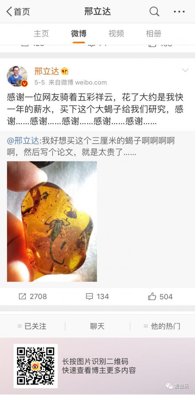 之前,研究古生物学者邢立达曾发微博说,想买个3厘米的蝎子,据说有网友真给送来了——