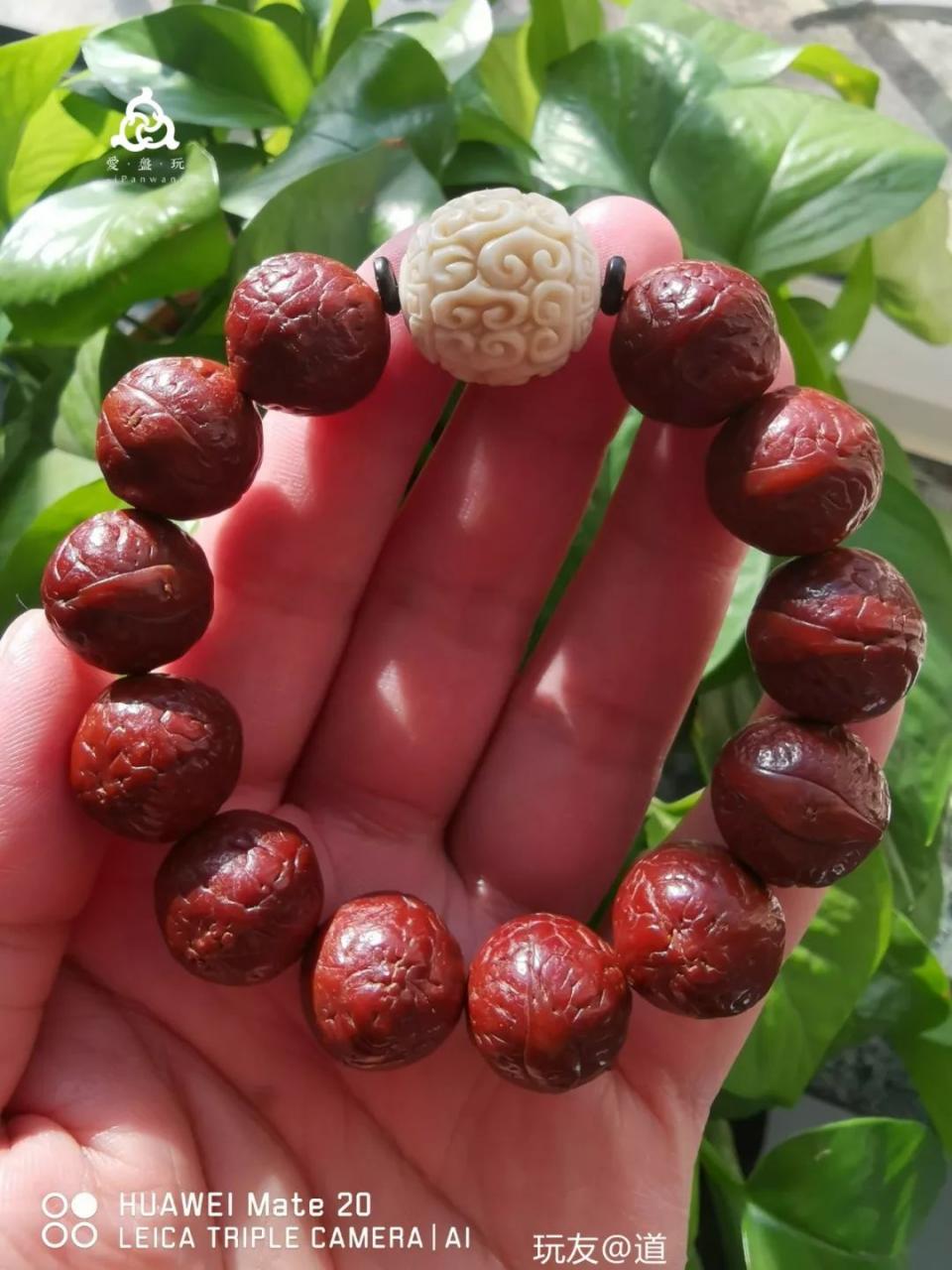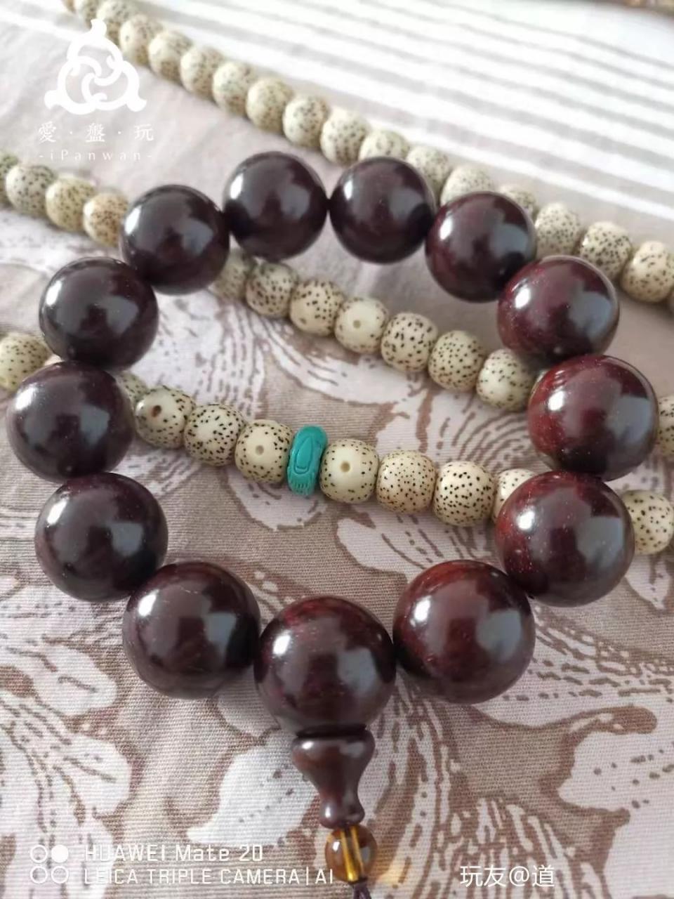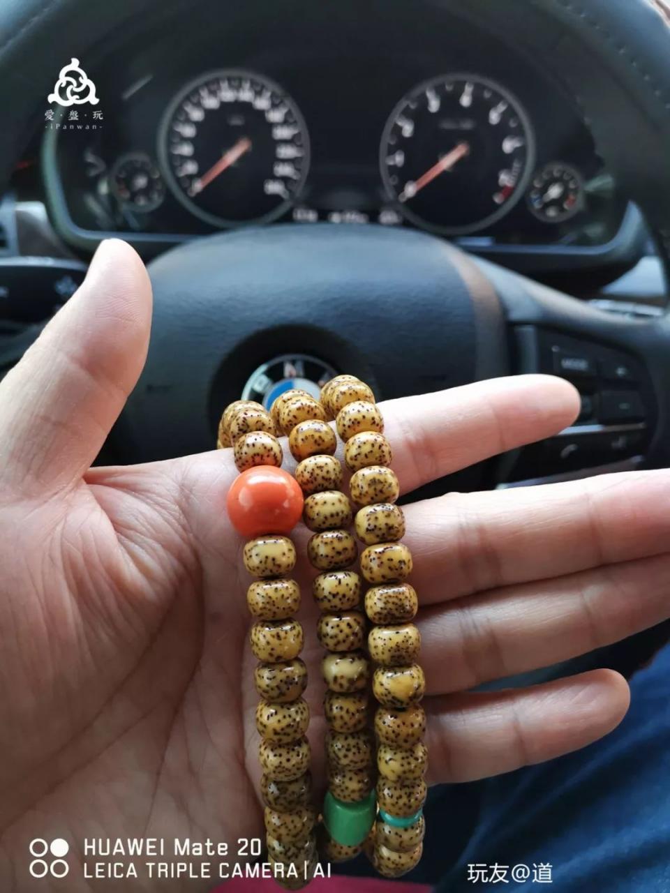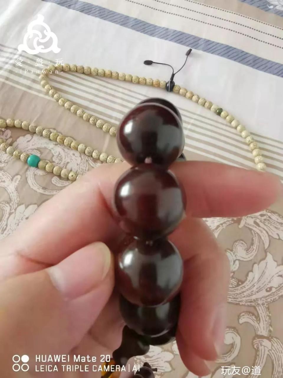 玩友@道是个干手,没多少汗,所以凤眼手串没有盘黑,提到盘玩秘诀。玩友@道说:凤眼盘玩没啥捷径,就是戴着白手套慢慢盘。