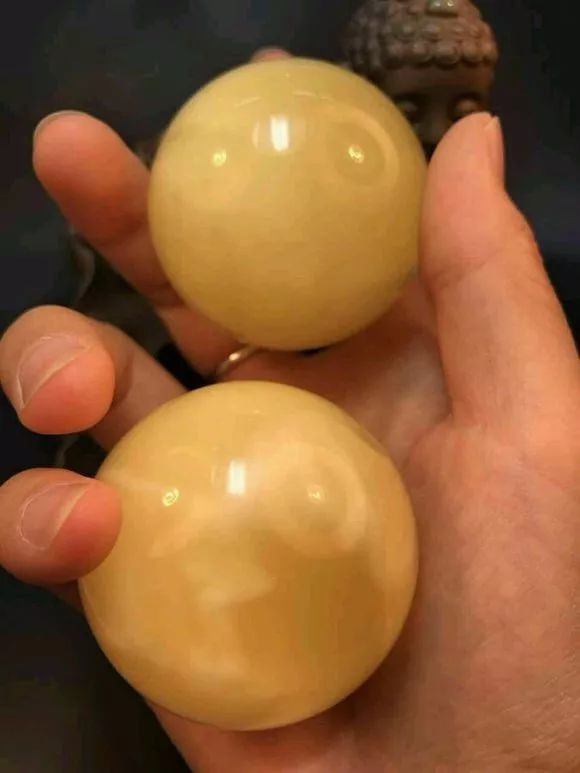 这一对蜜蜡健身球尺寸稍小,但也足够出门显摆了。