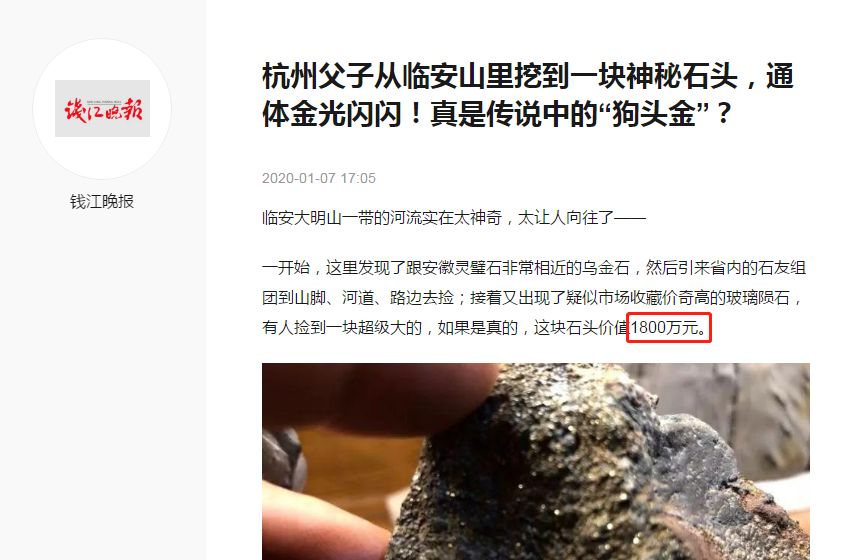 最近杭州寻宝行动浩浩荡荡,临安这边发现了乌金石,不知名玻璃陨石,疑似狗头金,每一块都价值超高。