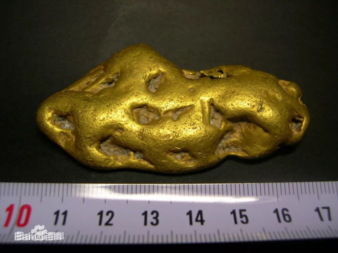 再来说说啥事狗头金。狗头金,为一种富金矿矿石,是天然产出的、质地不纯的、颗粒大而形态不规则的块金。它通常由自然金、石英和其他矿物集合体组成。有人以其形似狗头,称之为狗头金。