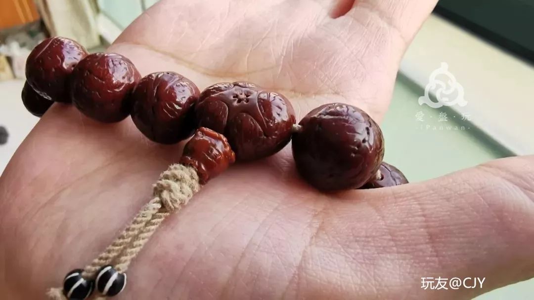 玩家@加吾-何小川 是大汗手,他先后盘了3条百香籽,新串儿到手先干刷3-5天,上手盘,一周晒2小时太阳,基本三个月能盘上色变红。