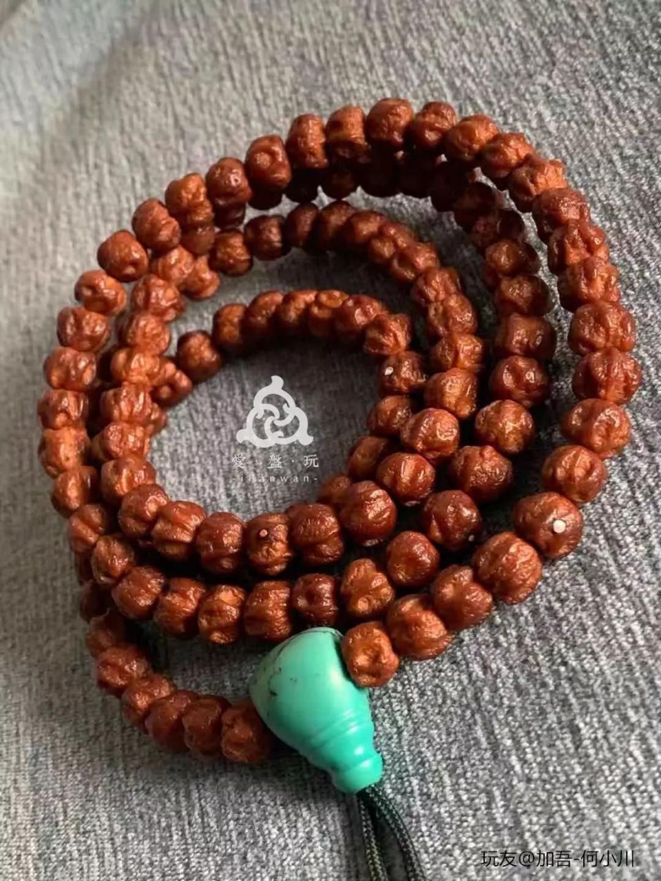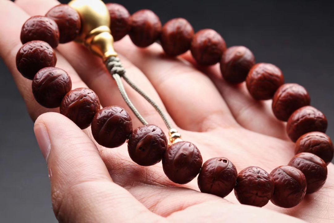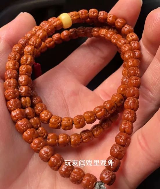 小核桃串,核桃中的一款,有着核桃的纹路,有瓣有脊。尺寸比文玩核桃小,桩型更圆润,周周正正,相似纹路串成小串。