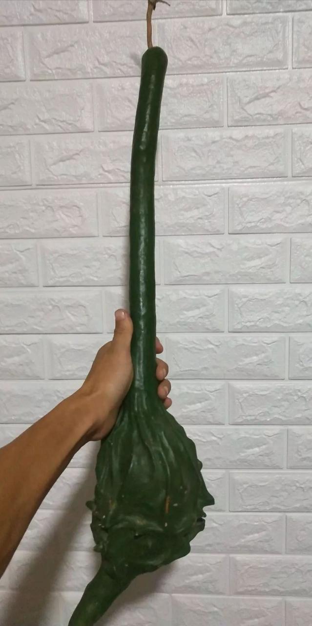 鹤首葫芦,又叫鹤首瓜,是一种非常奇特的观赏葫芦,脖颈弯曲起来很像仙鹤细长弯曲的脖子,而下部如同小皮球的瓜身,则是鹤的身体,瓜身底部的尖头,恰似鹤鸟的尾巴,“鹤首”的名字由此而来。