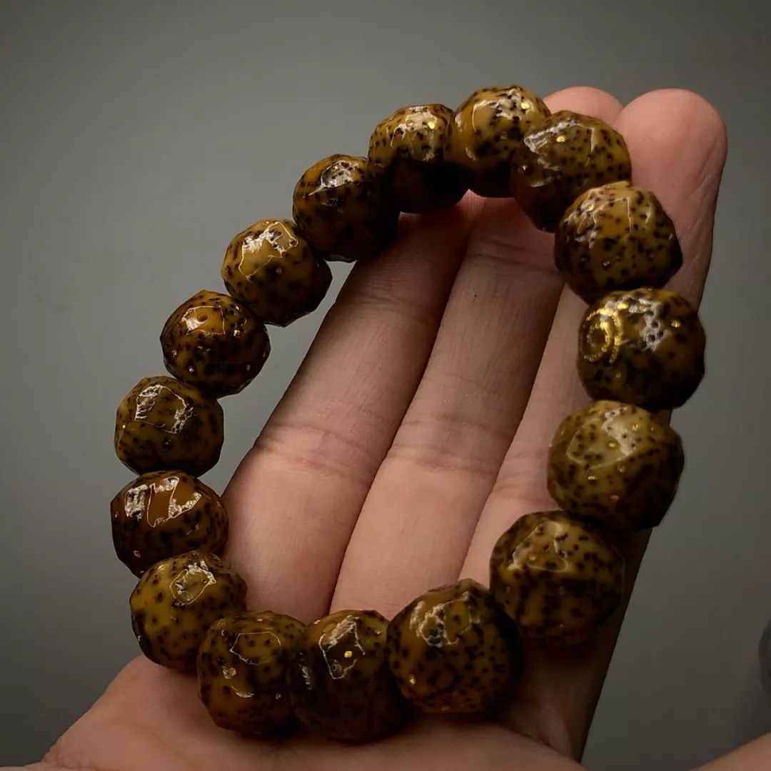 整个不规则星月菩提籽表面,花式嵌入黄金:螺旋状、万字符、星星月亮等,错金错得很奢华。