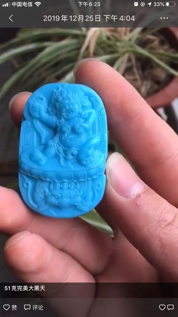 2018年起,他从一个商家手里买了好几次松石。最近一次买了个大黑天雕件,说是月儿谭的料子,但是拿到手里,却是一个假货!