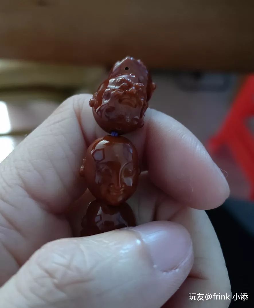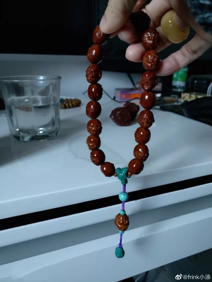 最近大家都有点无聊,他在看剧盘串时,打灯看了一眼手里的小籽罗汉,发现有些细节部分有点脏。因为这串橄榄核小籽玩了快十一个月,几乎没刷过,他决定清理一下。