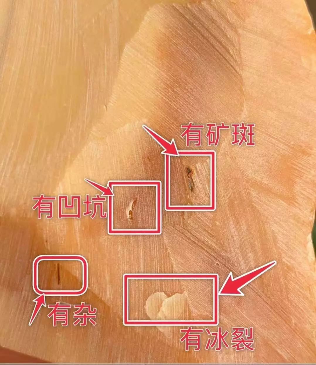 上图是一块看似不错的精挑大料,我特意用手机做了一些标注,让你们能一眼看到杂裂和瑕疵情况,这里请注意,目前缅黄的市场里,暇疵程度很大程度上决定了价格。