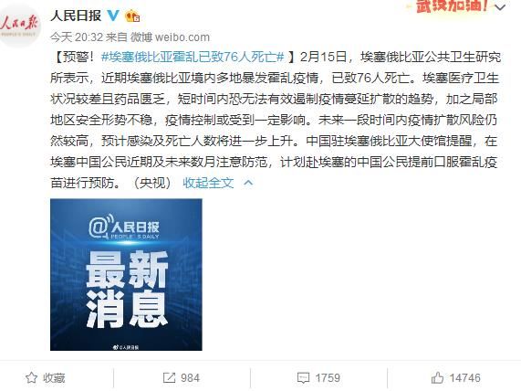 在非洲,先有尼日利亚爆发神秘怪病,后有霍乱病毒,2月15日,埃塞俄比亚公共卫生研究所表示,近期埃塞俄比亚境内多地暴发霍乱疫情,已致76人死亡。