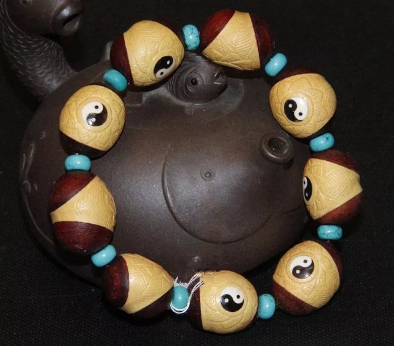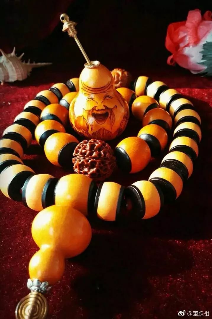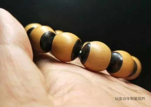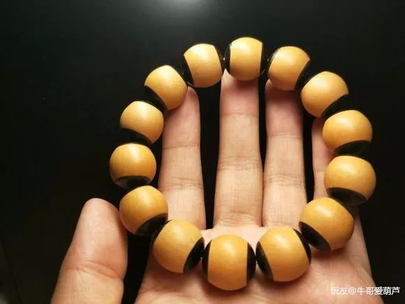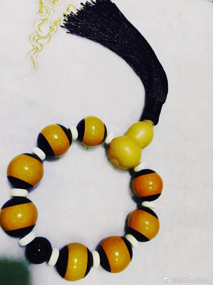 杨鹤通爱盘玩,最爱的手串就是这条葫芦黑檀木镶嵌的手串。
