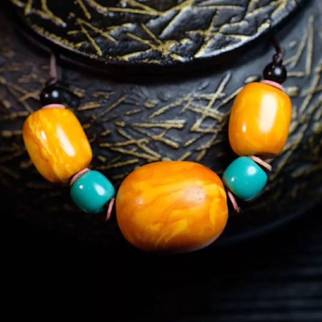 最后,看蜜蜡的颜色。老蜜蜡的颜色归为红、黄、花三大类,时间越久蜜蜡的颜色就越深沉。红皮老蜜蜡是蜜蜡中品质最好的,也是蜜蜡中万里挑一难寻的极品,价格也是极其昂贵。