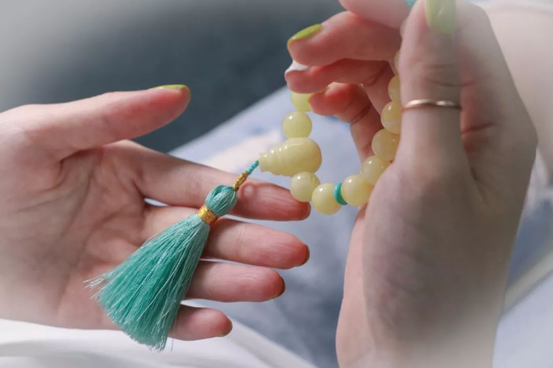 流苏做配饰也是有讲究的,据说:流苏状披头散发会使串内的福气流散,也使外界邪气更容易侵入,一般做个回转,把绳子穿回珠子再在珠底下打个结让避邪的珠子在最外侧,一下子增强了佛珠的防御力与凝聚力。
