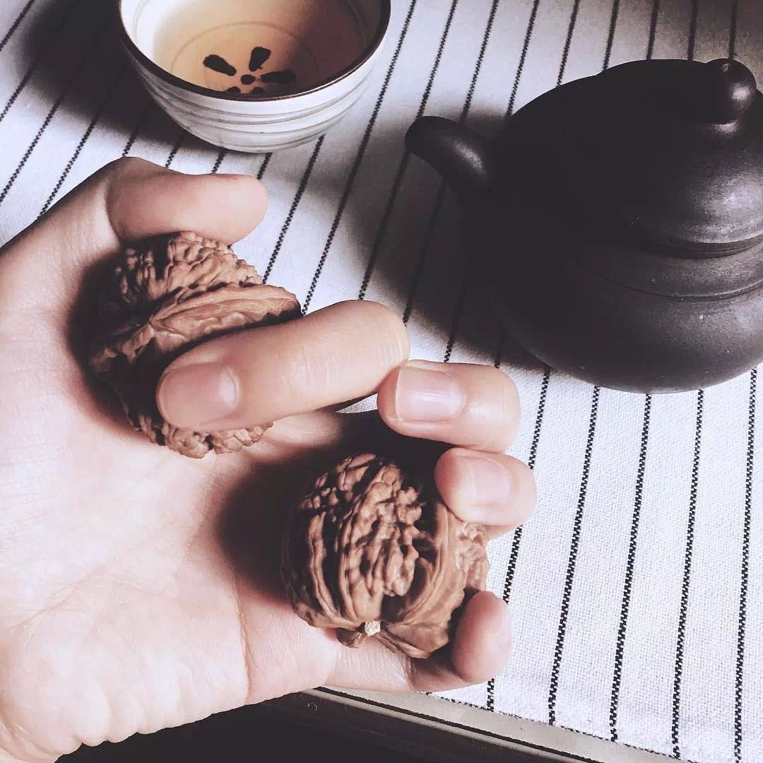核桃、玉石、各种雕刻,手把件的每一条纹路,都需要细细的抚摸。