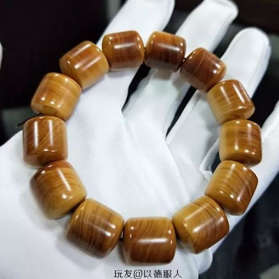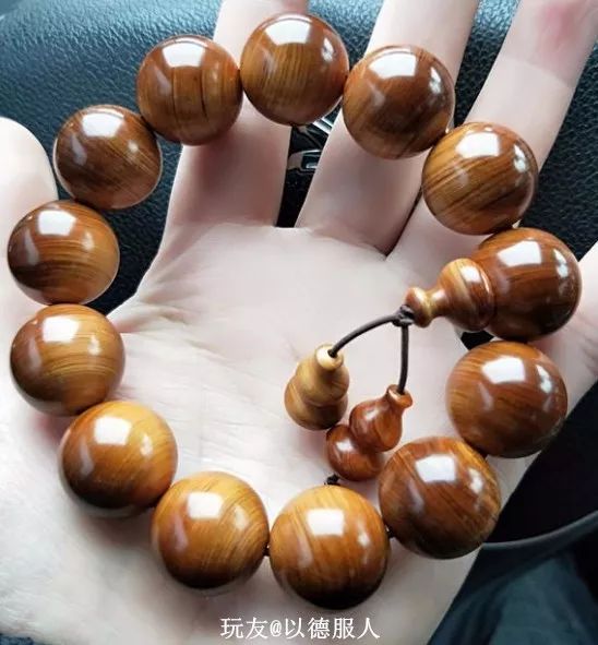 玩友@上古小虫喜欢玩崖柏手串,但又买不起带瘤花的,只好玩素串,他入手的素珠的价格都不贵,但是盘玩效果却非常好。这一条也是花了一百块钱买的: