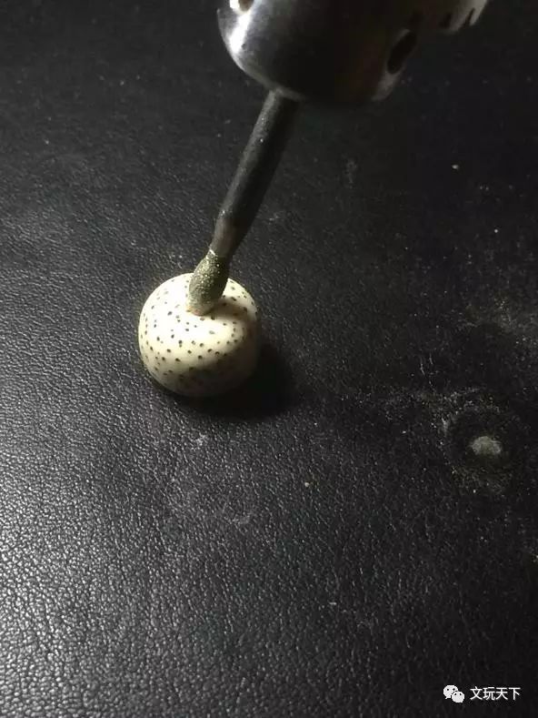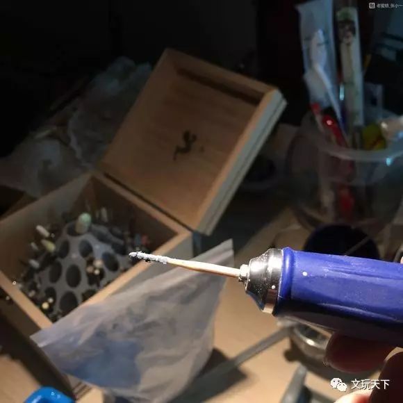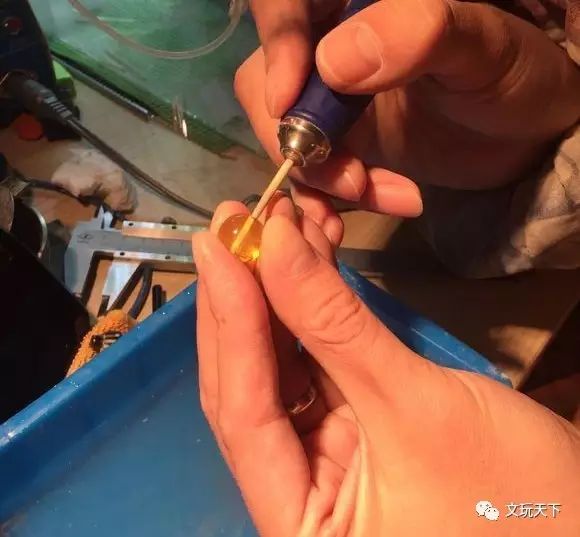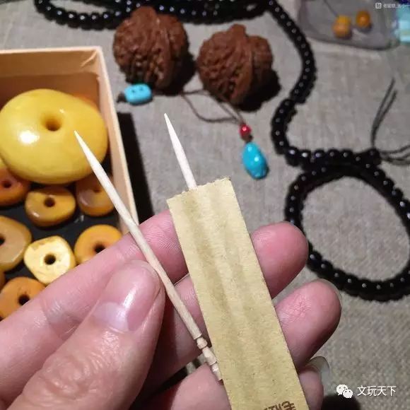 然后在牙签上抹上金刚砂,再固定到牙机上,就可以清洗琥珀珠的孔道了。需要注意的是,洗孔道的时候,要控制好钻速,以免孔道没洗成,琥珀珠却糊掉了。