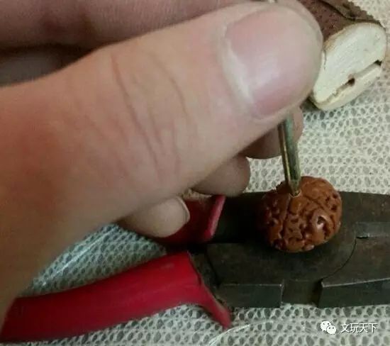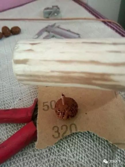 然后,用钉子或是扩孔工具,撑一撑塞好的铜管,以免在今后的盘玩过程中,铜管掉出来。