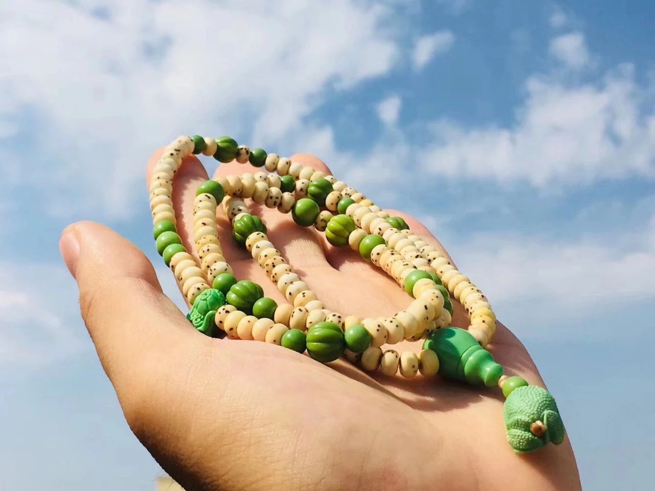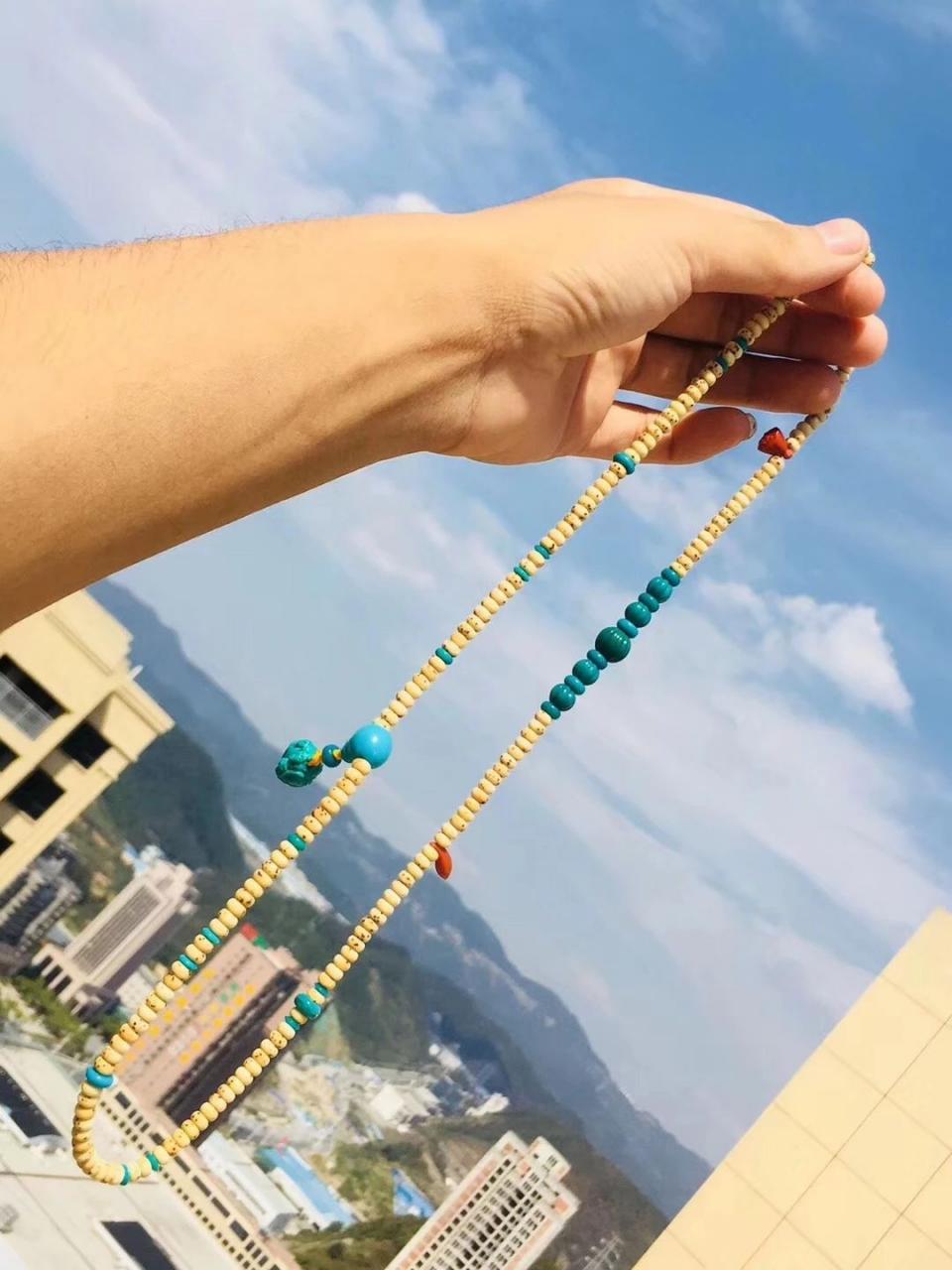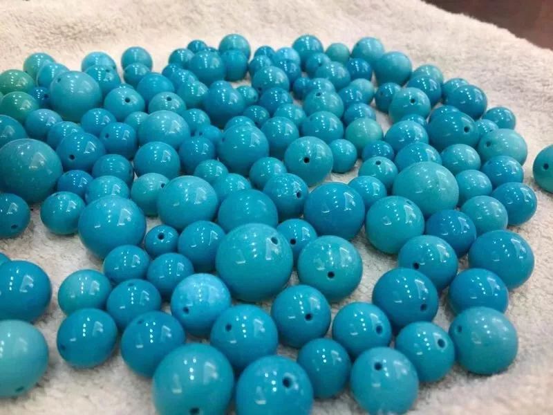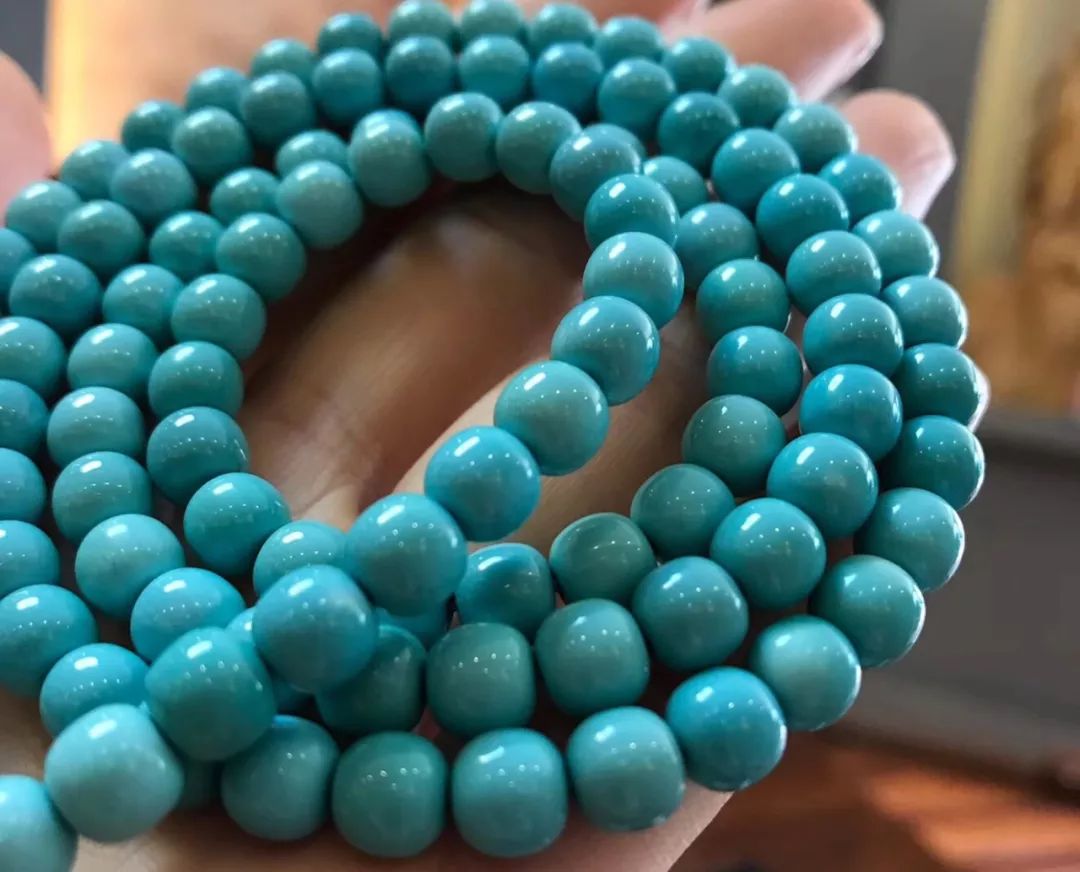 绿松石圆珠也比较常见,它可以配不同材质的佛珠(配挂坠或小雕件)、塔链等。绿松石圆珠的选取标准也很简单,主要看瓷度和颜色。瓷度越高,蓝度越高,价值就越大,也就越具有收藏潜力和保值升值的空间。