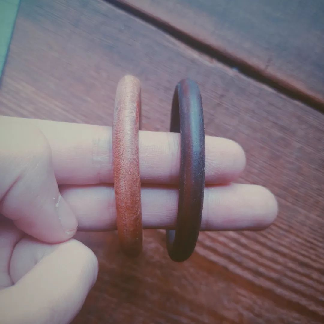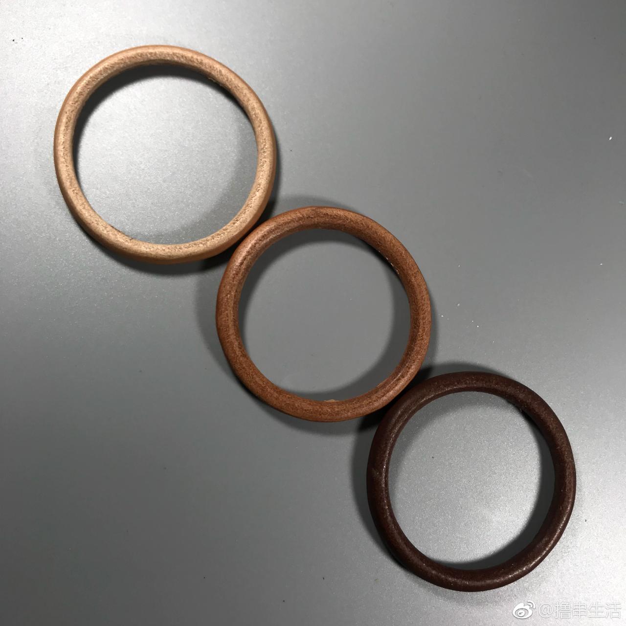 玩友@小孬 对枥木鞍革手环简直爱的深沉,从戴上就没拿下来过,他说一开始带有很多纤维毛 像个叛逆的少年~ 然后毛刺变短变硬像个跋扈的青年~ 慢慢的颜色变深 圈身表面变的平整 像一个圆滑的中年~ 最后整体暗沉 包浆厚重 柔滑泛光……像是个岁月沉淀的阿伯!