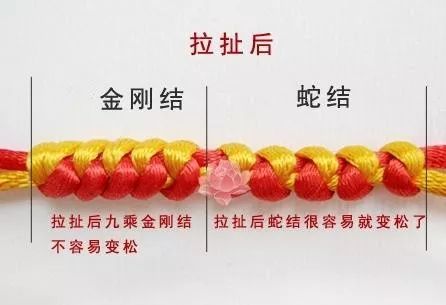蛇结比金刚结,手感上更柔软一些,所以相同的线材制作出来,蛇结柔和,金刚结坚挺。