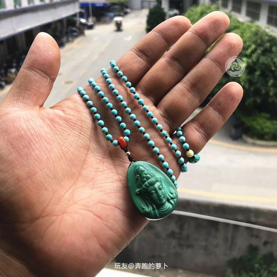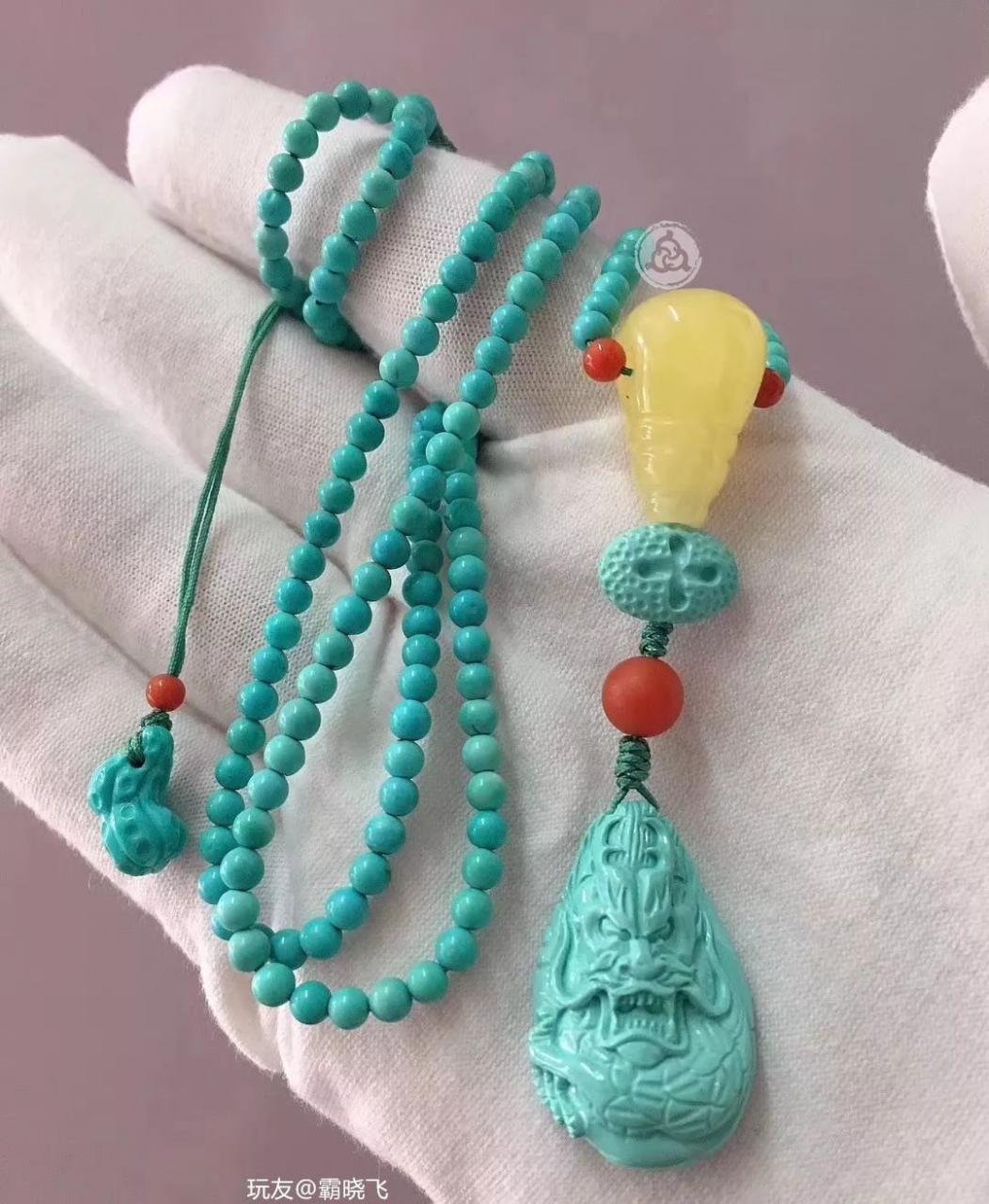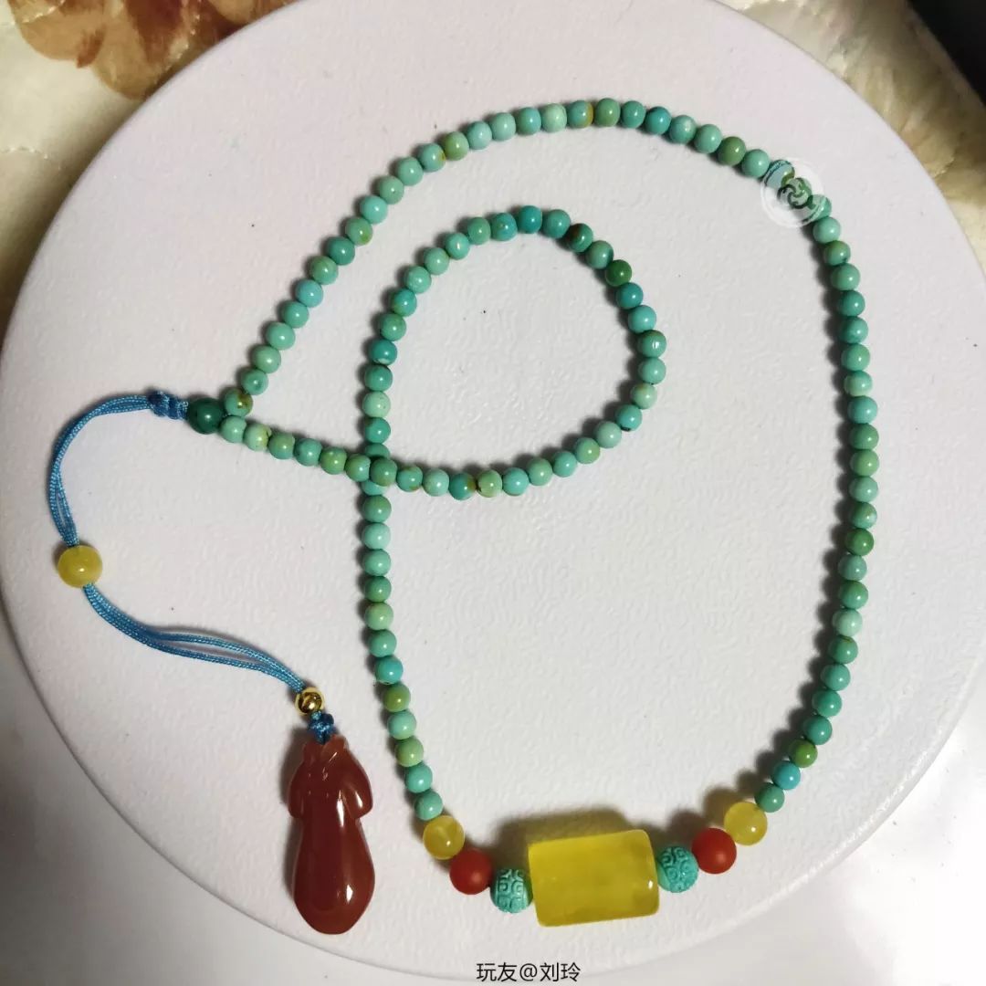 老盘有个朋友,最近就买了一串绿松石的小米珠,用来搭配她戴了十年之久的玉雕件。