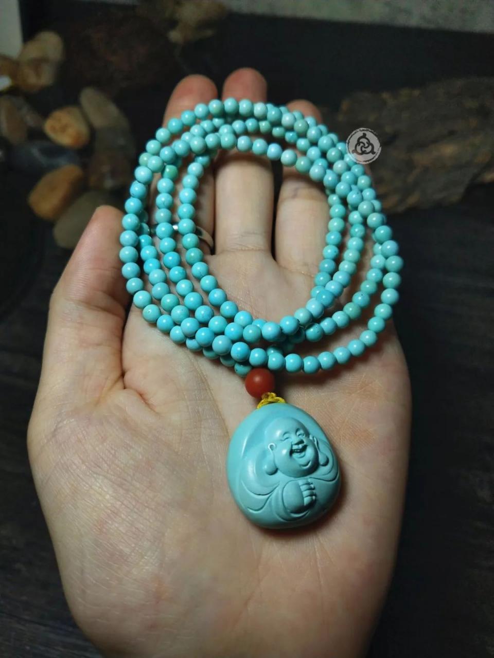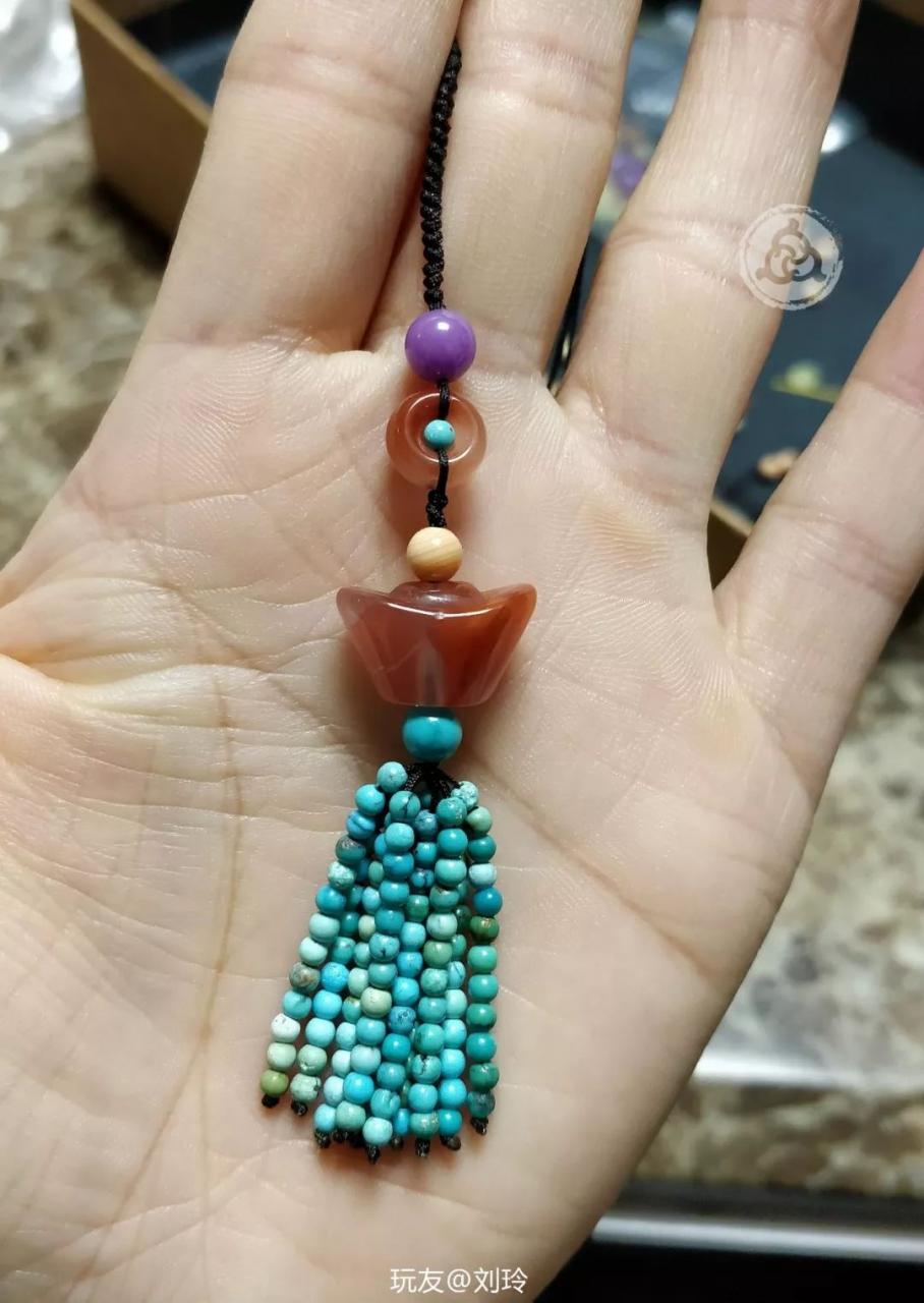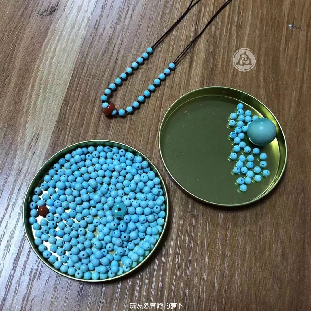 老盘有个朋友,最近就买了一串绿松石的小米珠,用来搭配她戴了十年之久的玉雕件。