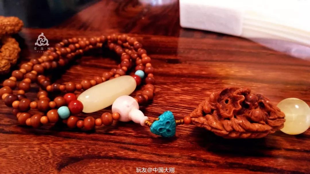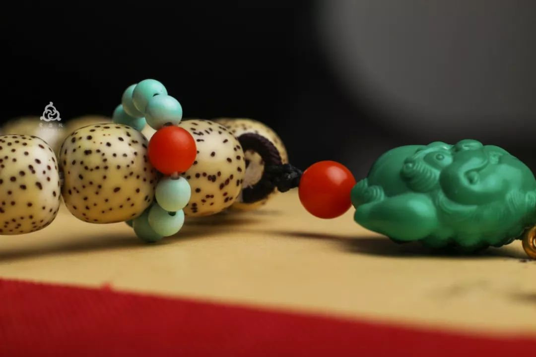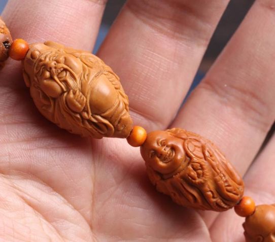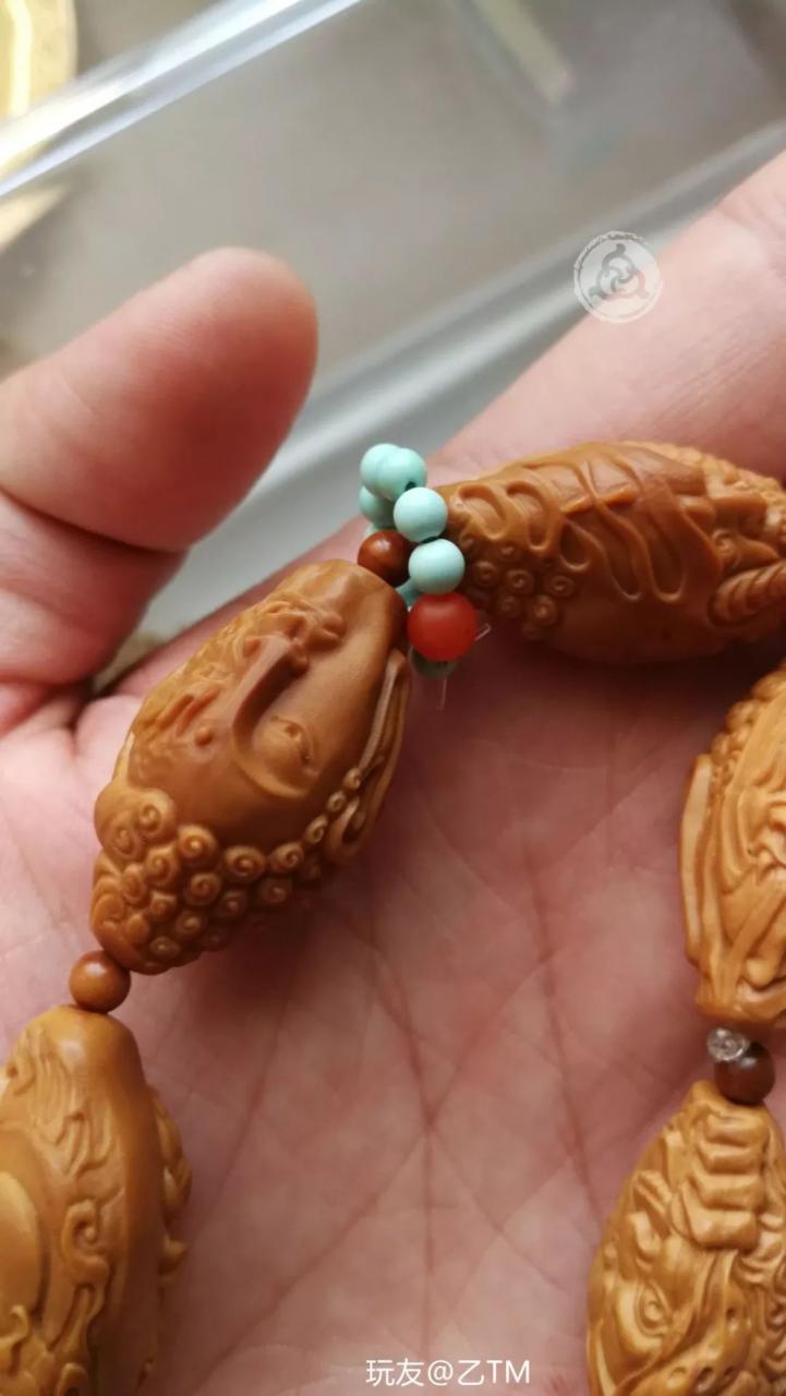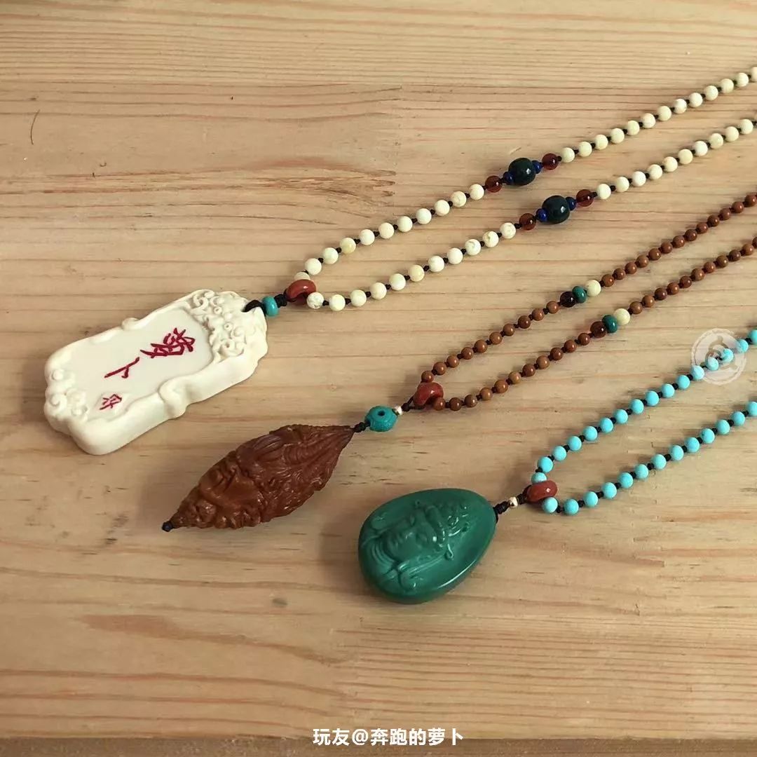 南红、松石、蜜蜡的小米珠,价格相对较贵,最适合搭配价格贵重的雕件。如果想价格更便宜一些,可以选橄榄核材质的,圆珠、竹节珠之类的造型有很多。