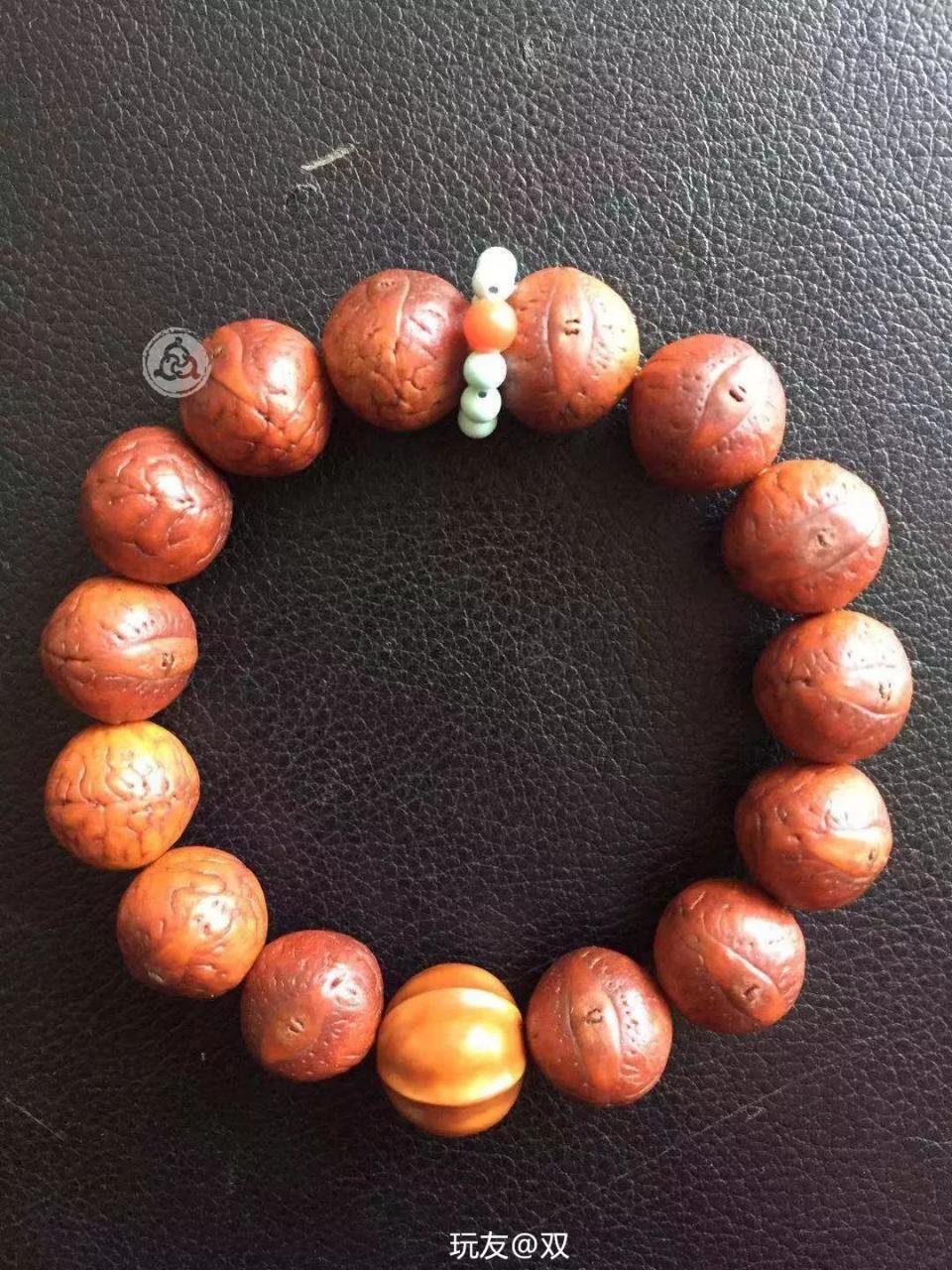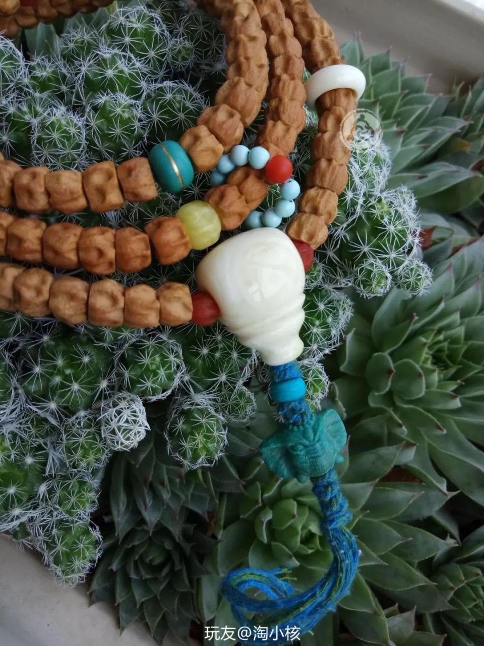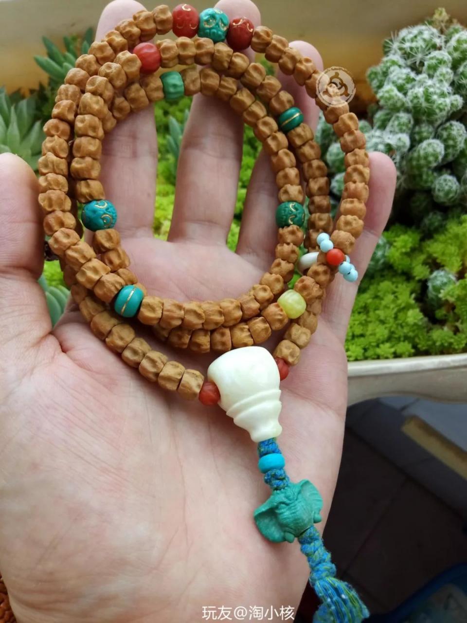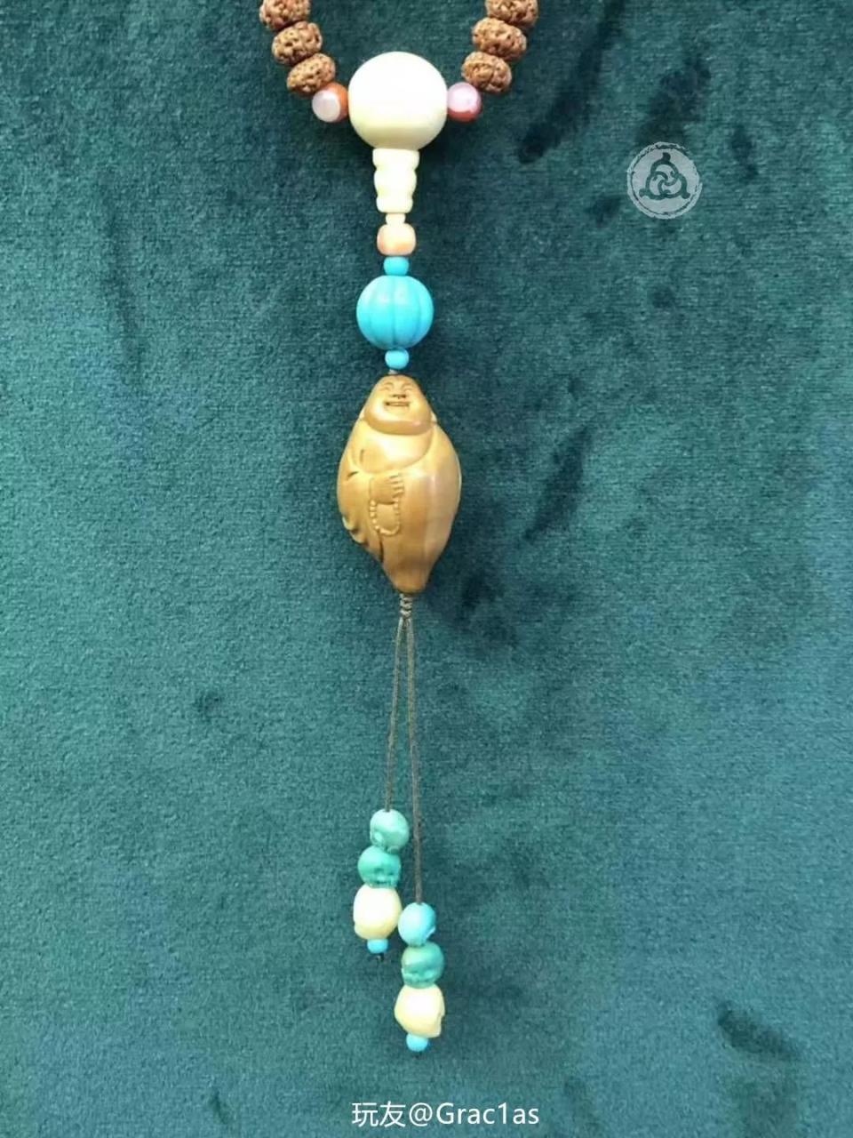 南红、松石、蜜蜡的小米珠,价格相对较贵,最适合搭配价格贵重的雕件。如果想价格更便宜一些,可以选橄榄核材质的,圆珠、竹节珠之类的造型有很多。