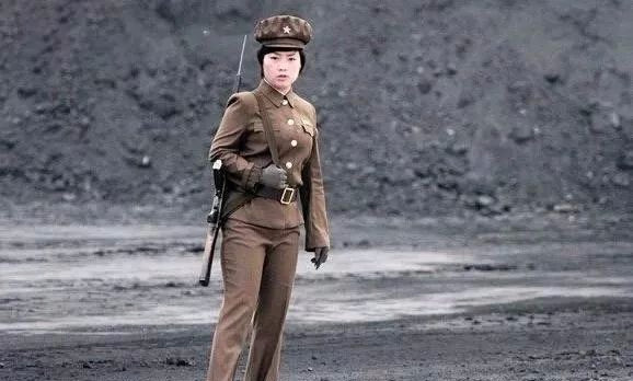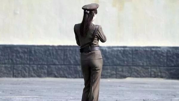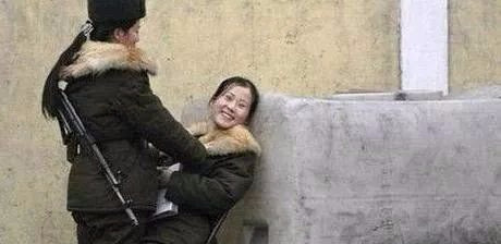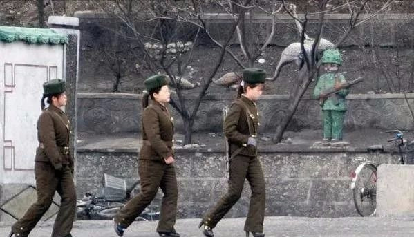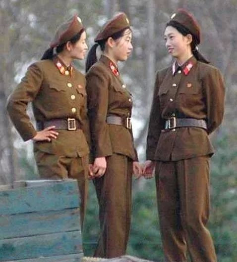 朝鲜女兵在执勤的间隙比较放松,在和战友嬉笑打闹。