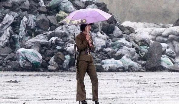 朝鲜女兵正在河边洗衣服,在江这边都可以看出她们的欢快