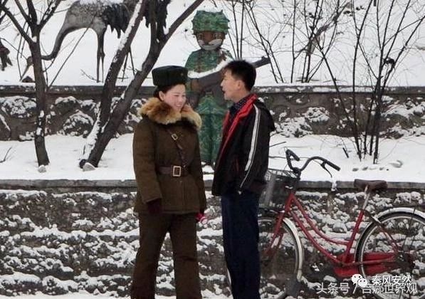 大冬天,刚下了第一场雪,女兵穿的厚厚的,在和别人交谈,女兵后边的看不出来是男是女