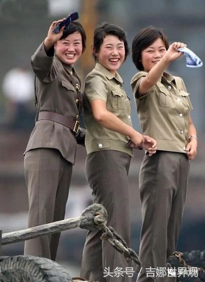 几个朝鲜女兵开心地朝鸭绿江上的中国旅游船挥手