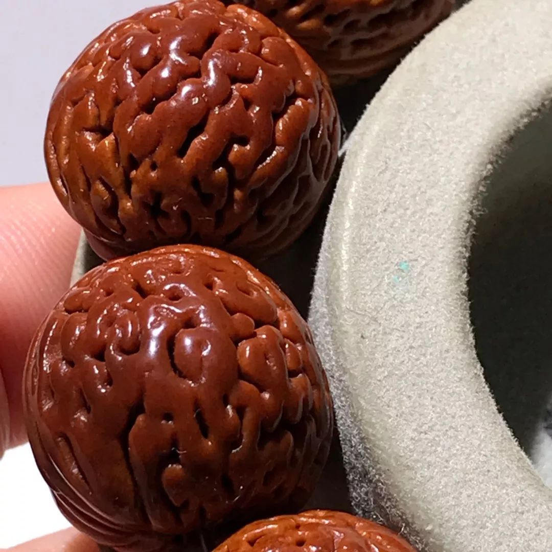 但凡天然产物,必有其特殊性,桃核亦不例外。与金刚菩提一样,桃核也有着各种不同的纹理和皮质,例如脑纹、龙纹、密纹、圆桩、矮桩等等。一条盘玩出来的桃核手串同样会引起玩友们的冲动。