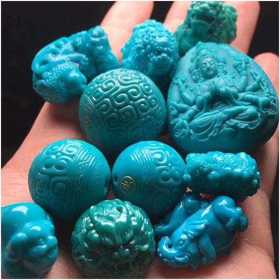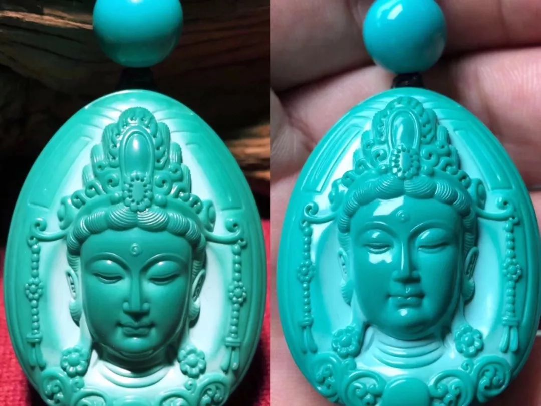 4、玉化!当已经包浆挂瓷的绿松石继续盘玩脱水,皮质层和液状蜡层继续增厚,当打灯光照射时,绿松石呈半透明状,犹如玉石一般,这就是所谓的玉化。