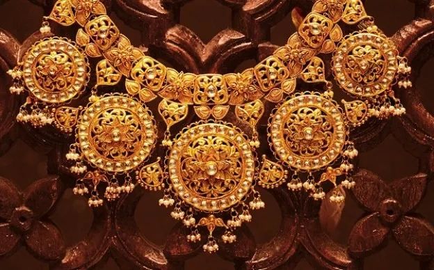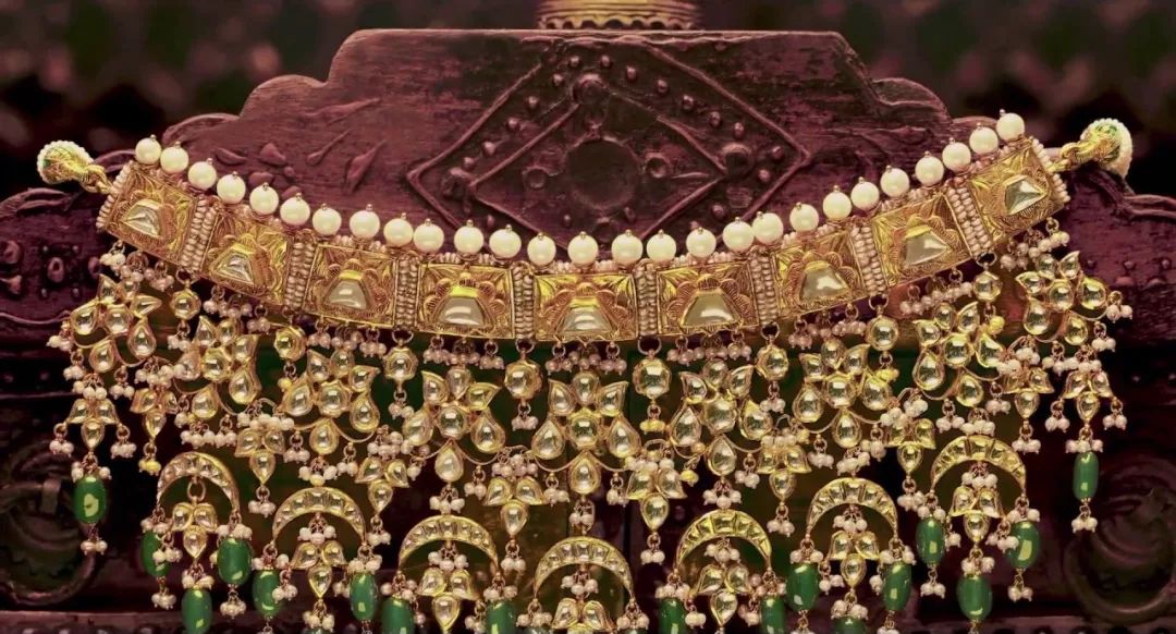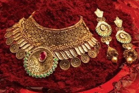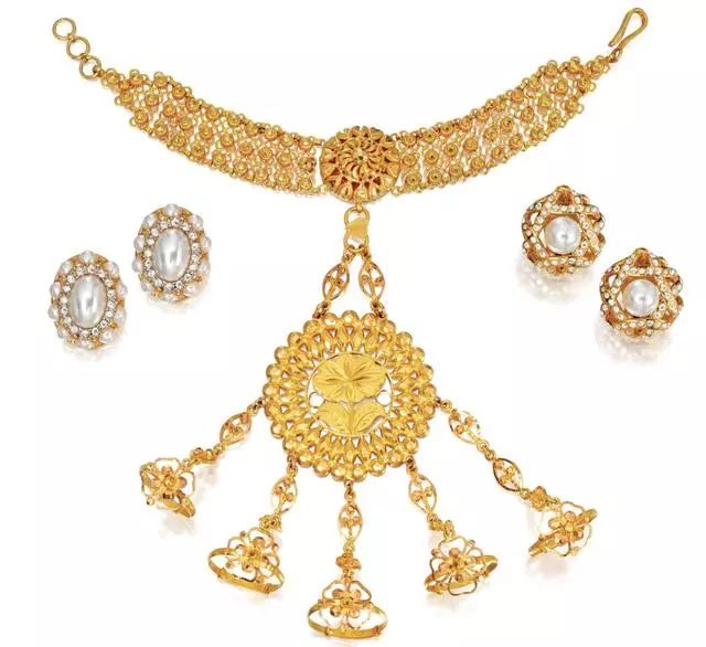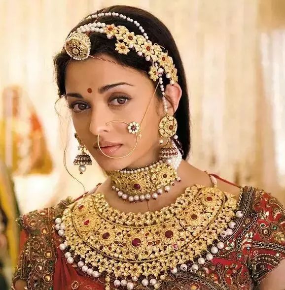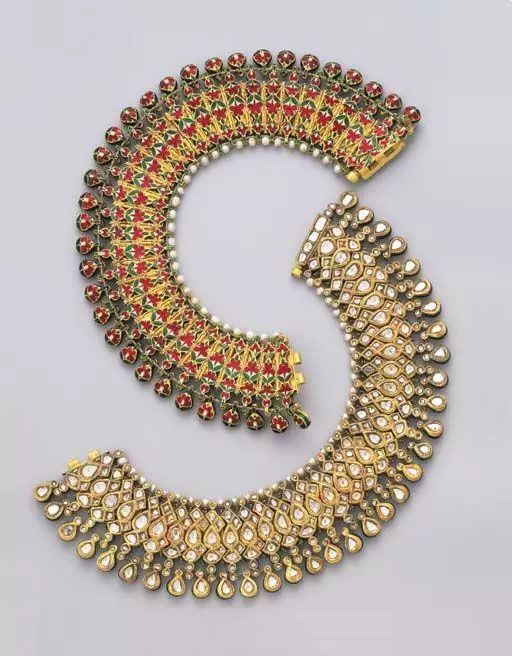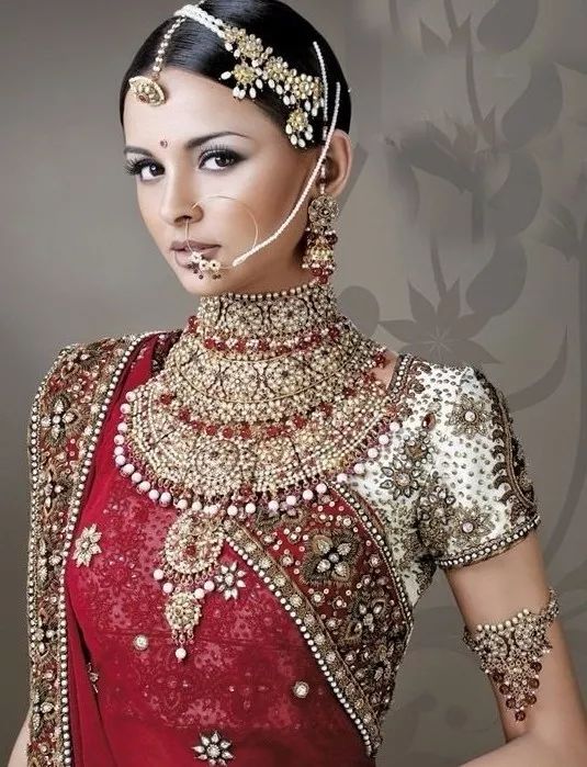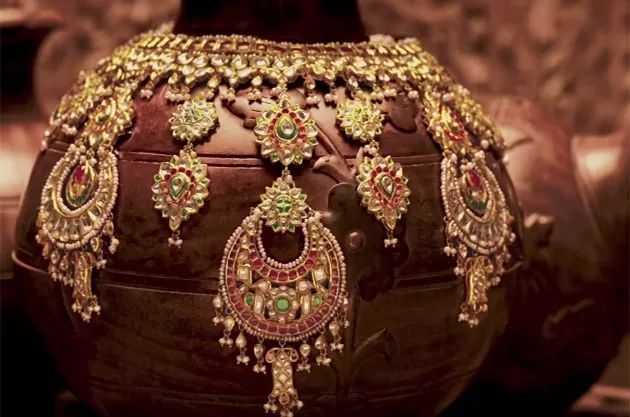 在印度人看来,珠宝从来都不是以“件”为单位,而是应该以“套系“为基础。这种珠宝套装的历史起源于王室对于身份的追求,这些保守的统治者们希望用庄严而浑然一体的整体美感来彰显自己的财富和权力。这种思想在民间流传开来,每逢节日庆典,印度女子身上就会装点以成套的首饰,行走起来叮呤当啷。戴上数十种的各种承载着不同吉祥寓意的珠宝,从而形成一种华丽的独有的印度风俗。