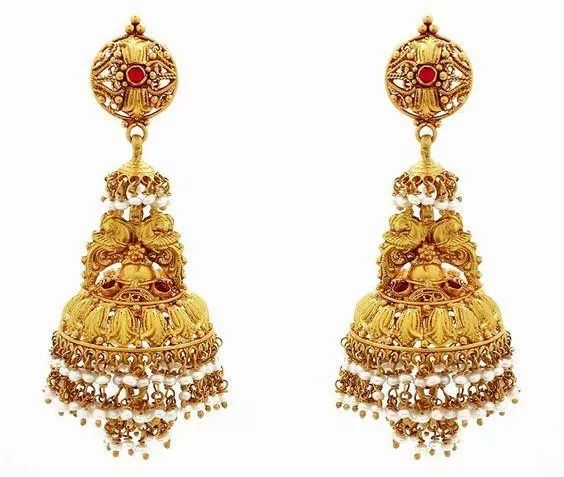 这种小铃铛/雨伞形状叫Jhumka,是我最喜欢的耳环形状。日常生活中戴的比较小,也就指甲盖那么大吧;尺寸超过大樱桃,基本就是给新娘戴的了,一对22k黄金的耳环要用到14克以上。买不起纯金的也没关系,镀金耳环超便宜,只要十几二十块。