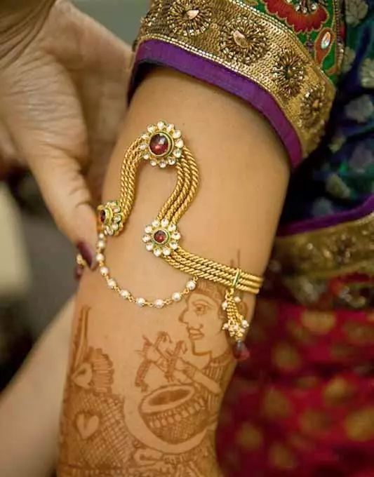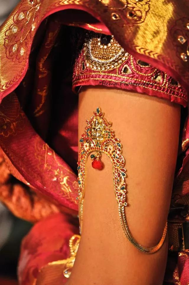 泰米尔语管戴在大臂上的这种装饰叫Vanki(k发g的音),现在还能在南印新娘和古典舞舞者的身上见到。
