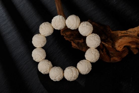 霸气外露的盘龙手珠,其牙色呈淡黄,水润冰料满纹无暇,经冰封沉淀而遗存成化石,雕琢何其精细,十二巨龙盘玩于手中,乃不可多得之珍宝。